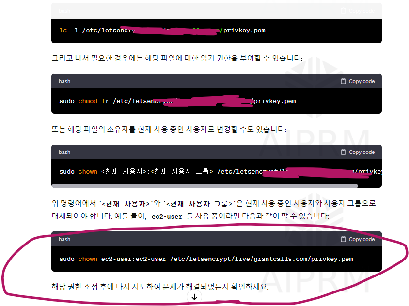 .env파일에 많은 보안key와 id를 넣게 됩니다. 이때 ssl부분이 오류가 많아요. 따라서, ssl키는 아래의 명령어를 통해 권한을 줘야만 오류가 없게 됩니다.
