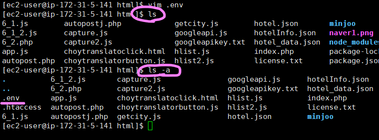 - 아래 내용을 보면 ls -a 후에 .env가 생성된 것을 알 수 있습니다. ( -a는 숨은 파일도 보는 명령옵션. )