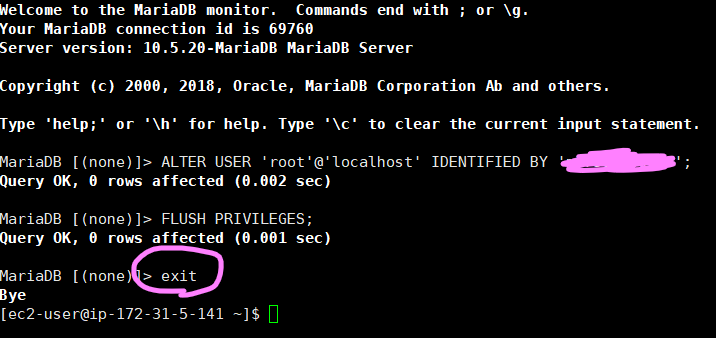 4.번 명령 후에 exit 명령어 입력하여 빠져 나오면 됩니다.^^