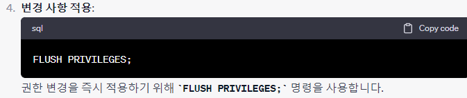 마지막으로 권한을 주기 위하여 아래의 명령어를 입력하면 모두 완료 됩니다.!!