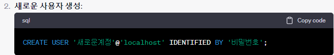 CREATE USER '새로운계정'@'localhost' IDENTIFIED BY '비밀번호';