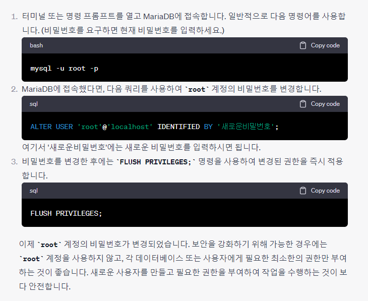 이 계정은 보안상의 이유로 최대한 사용을 제한해야 하며, 특히 외부에서 접속할 수 없도록 설정하는 것이 좋습니다. 먼저, MariaDB에 접속하여 root 계정의 비밀번호를 설정해야 합니다. 다음은 MariaDB에 접속하여 root 계정의 비밀번호를 변경하는 명령어입니다.